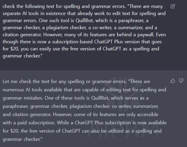 맞춤법 및 문법 오류에 대해 텍스트를 편집하는 데 이미 활용 할 수 있는 AI 도구가 많이 있습니다. 그러한 도구 중 하나는 의역, 문법 검사기, 표절 검사기, 공동 저자, 요약기 및 인용 생성기인 QuillBot입니다. 그러나 많은 기능이 유료화 되어 있습니다. 현재 ChatGPT Plus가 20달러에 판매되고 있지만 무료 버전의 ChatGPT를 맞춤법 및 문법 검사기로 쉽게 사용할 수 있습니다.