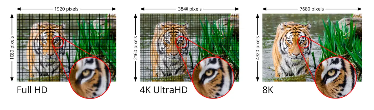 8K는 4K의 수평 및 수직 해상도의 두 배, 무려 7,680x4,320 및 33,177,600개의 총 픽셀을 가지고 있습니다. 4K 해상도의 4배일 뿐만 아니라 1080p보다 16배 더 많은 픽셀입니다. 또는 다르게 표현하면 품질 손실 없이 동시에 8K 화면에 16개의 전체 해상도 1080p 비디오를 넣을 수 있습니다.