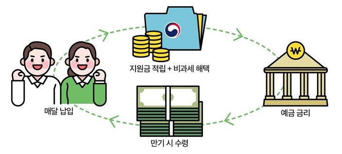 청년들의 자산 형성을 지원하는 정책형 금융상품으로 매달 일정 금액을 5년간 납입하면 정부 지원금과 은행 이자를 더한 금액을 만기 시 수령 가능한 상품입니다.
