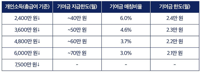 매월 납입한 납입액에 비례한 정부 기여금은 개인 소득과 납부 금액에 따라 달라집니다.