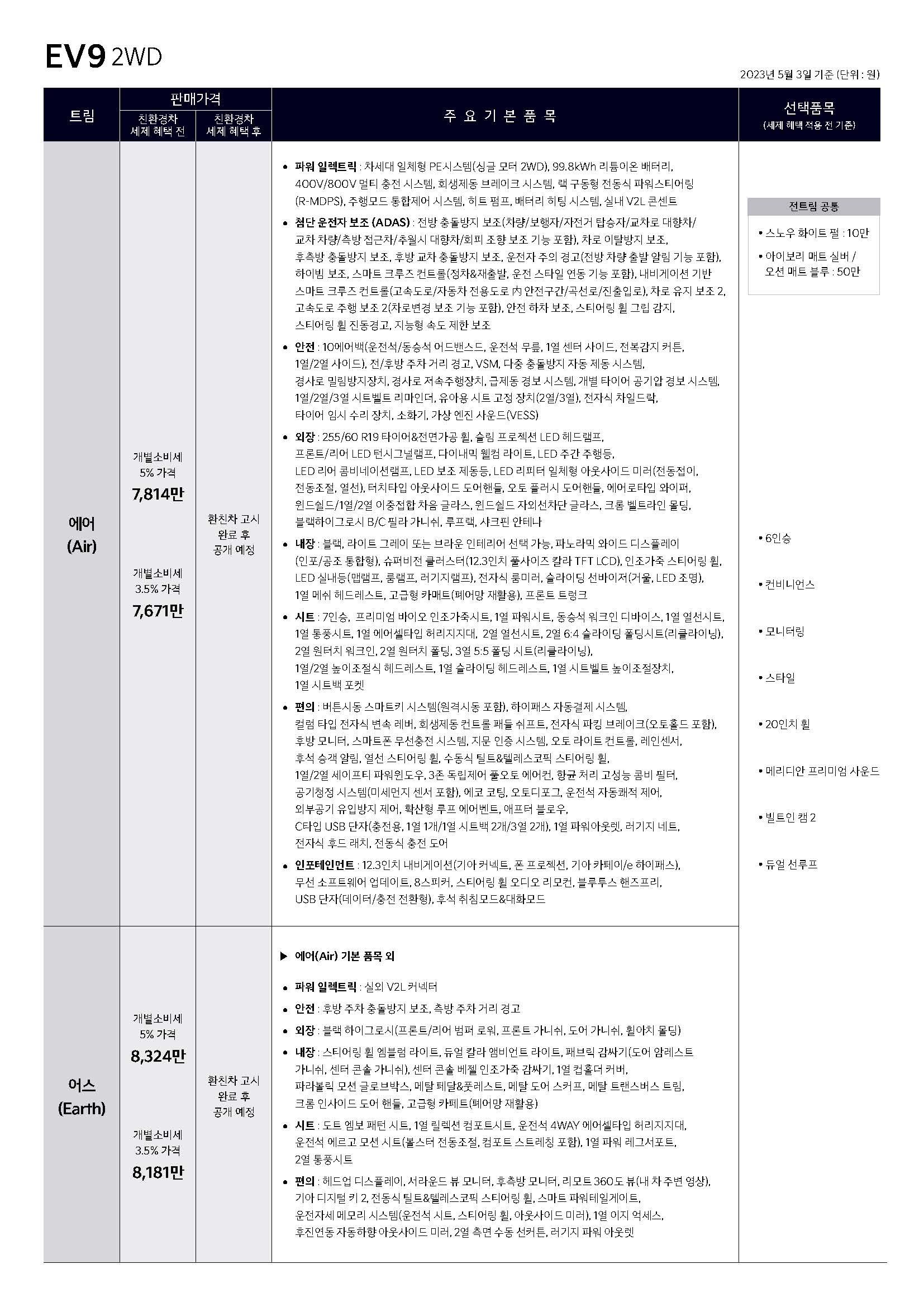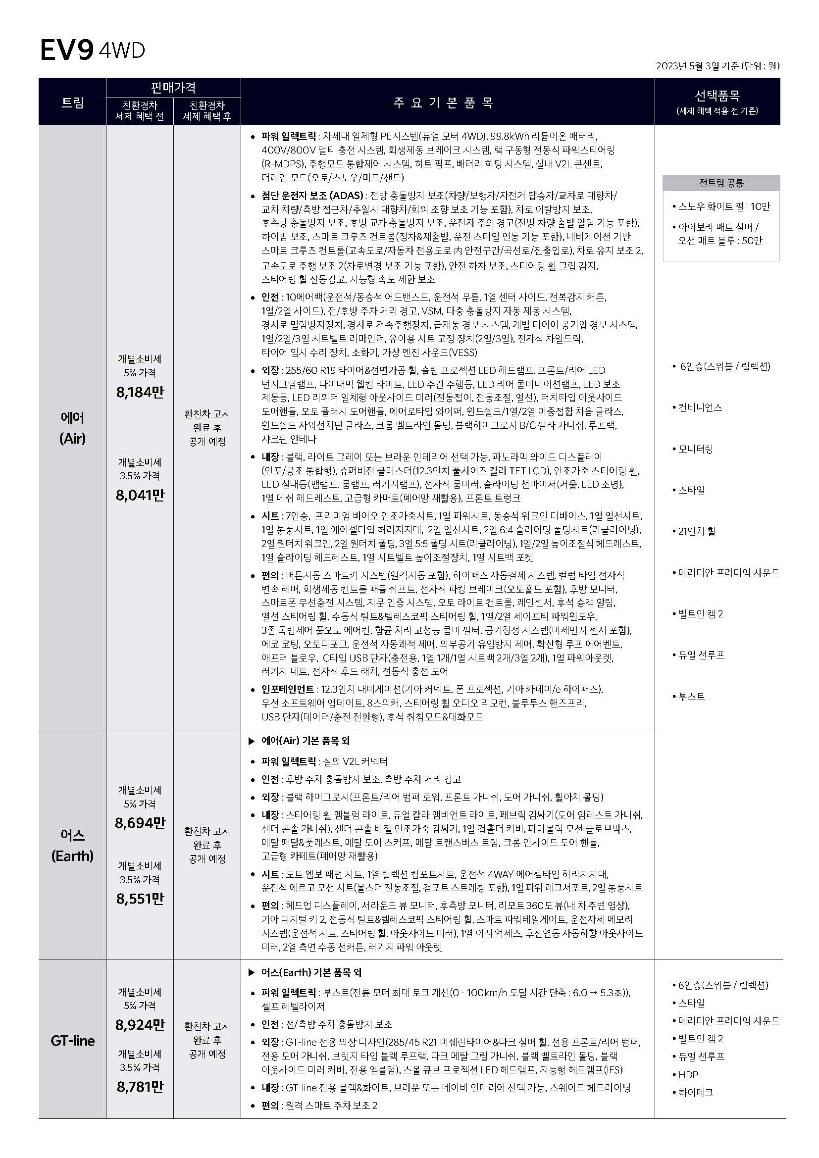 기아의 EV9은 총 5개의 트림으로 구성되어 있습니다. 개별 소비세 3.5%를 적용할 경우 친환경차 세제 혜택 전 가격은 7,671만원에서 트림에 따라 8,981만원까지 이르고 있습니다.