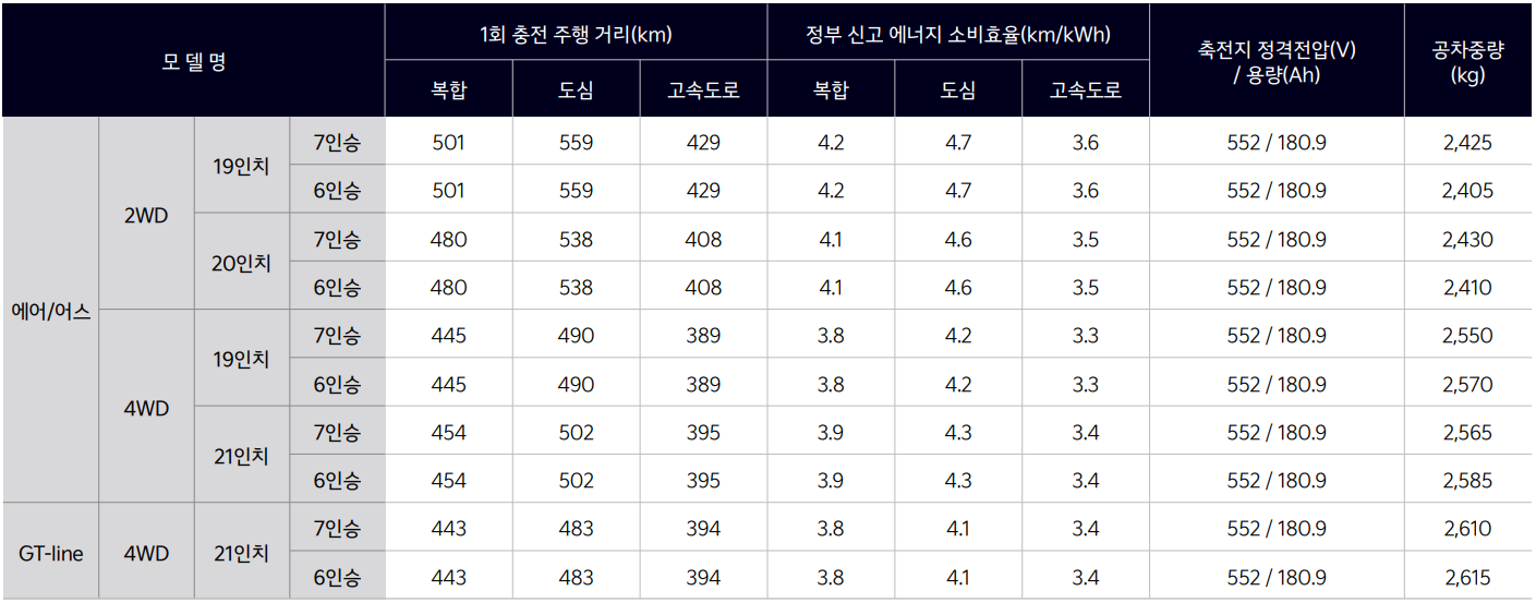 EV9의 기본 제원을 살펴보면 전장은 5,010mm, 전폭은 1,980mm, 전고는 1,755mm, 휠베이스는 3,100mm를 보유하고 있다. 배터리 용량은 99.8kWh이며, 모터 최고 출력은 2WD는 150kW/ps, 4WD는 283kW/ps 입니다. 모터의 최대 토크도 2WD 350Nm이고 4WD는 600~700Nm의 성능을 갖추고 있습니다.