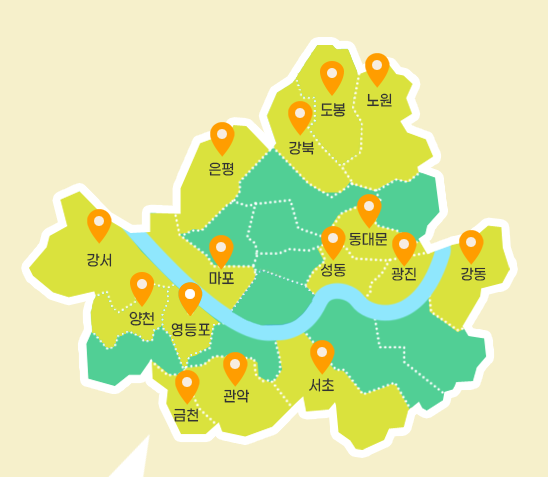 위치: 강서구, 양천구, 영등포구, 금처구, 관악구, 서초구, 마포구, 은평구, 강북구, 도봉구, 노원구, 성동구, 동대문구, 광진구, 강동구 등 총 15개 구에서 운영 중
