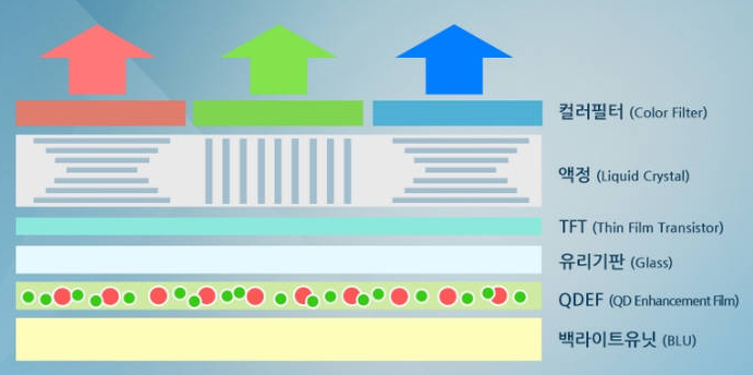 Samsung에서 개발한 QLED(Quantum-dot Light Emitting Diode) TV는 이름에서 알 수 있듯이 이러한 Quantum Dots 기술을 활용합니다. Samsung QLED TV에서는 LED 백라이트로부터 오는 파란색 빛 아래에 위치한 양자 점 층(Quantum dot layer)이 초록색과 붉은색 광원으로 변환되어 각각 다른 색상의 밝기를 생성합니다.