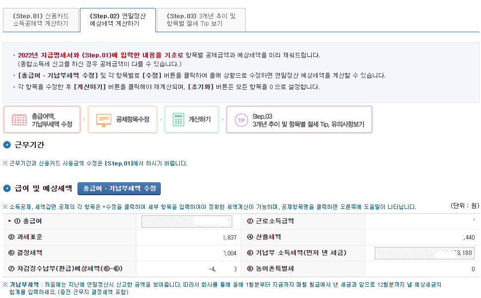 다음은 연말정산 예상세액을 계산하는 단계입니다. 이번 단계에서의 예상 세액은 2022년 지급명세서와 STEP1에서 입력한 내용을 기초로 항목별 공제금액과 예상세액을 미리 알려드립니다.