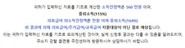 그렇다면 내가 속한 가구의 중위소득 60%와 중위소득 100%는 얼마를 의미할까요? 복지로 사이트에서 본인 가구의 가구수 및 소득, 재산 금액을 입력하고 결과보기를 하면 자동으로 본인이 속한 가구의 소득이 중위 소득 몇 프로에 해당하는지 확인할 수 있습니다.