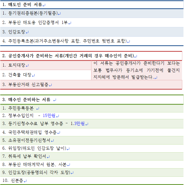 오늘 여기서 내가 설명하고자하는 것은 등기신청에 필요한 서류준비가 중심이다. 이를 중심으로 기존의 법무사가 했던 이런 단순 매매건에 대해 내가 혼자서 도전해 보았다. 부동산 거래 잔금일에 필요한 서류는 많은 블로그에 나와 있듯이 다음과 같다. 누군가는 이러한 일은 그냥 서류외워서 내면 된다고 말했다. 그렇지만 부동산 등기를 처음 하는 사람들은 이런 서류가 어디서 발급받고 어디에 제출하는지 궁금하다. 그래서 하나하나 매우 구체적으로 설명해 보고자 한다. 잔금일 당일에 매도인과 공인중개사, 매수인이 준비해야할 서류와 발급 방법을 우선 정리해 보자.