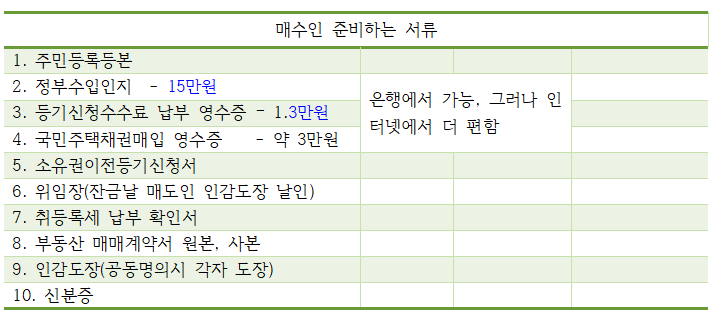 매수인이 준비해야하는 서류가 꽤 많습니다. 매수인이 준비해야 할 서류는 다음 글에 이어서 올리겠습니다.