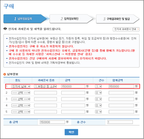 다음은 바로 금액을 입력하는 단계입니다. 금액은 부동산 매매가에 따라 달라집니다. 거의 대다수의 부동산 물건이 아마 1억원 ~ 10억원 이하 구간에 속할 것입니다. 그럼 전자수입인지는 15만원을 구입하면 됩니다