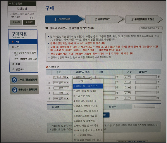 저 같은 경우에는 가입된 공인인증서로 로그인했습니다. 그 이후 왼쪽에 커다랗게 보이는 구매 버튼을 클릭합니다. 그러면 또 다시 아래와 같은 창으로 전환됩니다. 이러한 구매 창에서 우리는 납부 용도라는 드롭메뉴에서 ‘인지세 납부’를 선택합니다. 그러면 옆에 과세문서 종류 컬럼에 약 12개의 과세문서 종류가 나타납니다. 저는 이번에 상가매입이기 때문에 당연히 ‘부동산 등 소유권 이전’을 클릭했습니다. 아파트나 빌라, 주택 등은 전부 ‘부동산 등 소유권 이전’을 클릭하면 됩니다.
