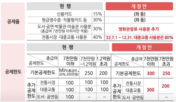 세 번째 개정사항은 2022년 7월 1일부터 12월 31일까지의 대중교통 사용분에 대해서 소득공제율이 40%에서 80%로 상향되었습니다. 이 혜택은 23년 1월 1일 이후 연말정산하는 분부터 적용됩니다.