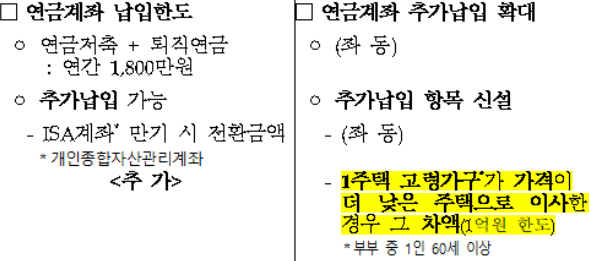 그리고 연금계좌 추가납입 확대가 되었습니다. ISA 계좌 만기 시 전환금액과 1주태 고령 가구가 가격이 더 낮은 주택으로 이사한 경우 그 차액을 1억원 한도까지 추가 확대 합니다.