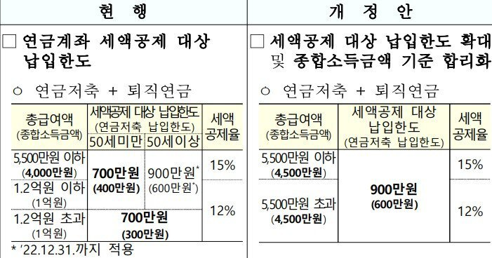 연금계좌에 연금을 납입하게 되면 일정금액을 한도로 세액공제를 적용받을 수 있습니다. 기존에는 연령에 따라 구분되었던 부분이 개정안에서는 나이 구분 없이 총 급여 1.2억원을 초과하는 분들까지도 포함해서 900만원으로 확대 되었습니다.