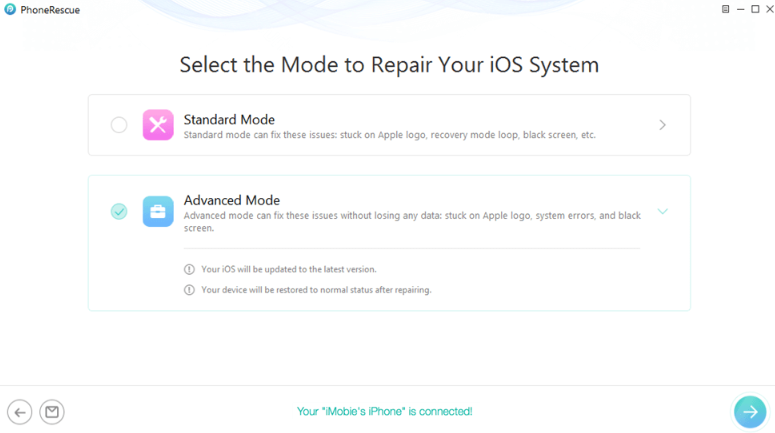 STEP 2. 선택할 수 있는 두 가지 복구 모드가 있습니다. 고급 모드를 사용하면 데이터 손실 없이 아이폰을 복원할 수 있습니다. 표준 모드를 선택하면 아이폰을 공장 초기화 상태로 복원할 수 있습니다.