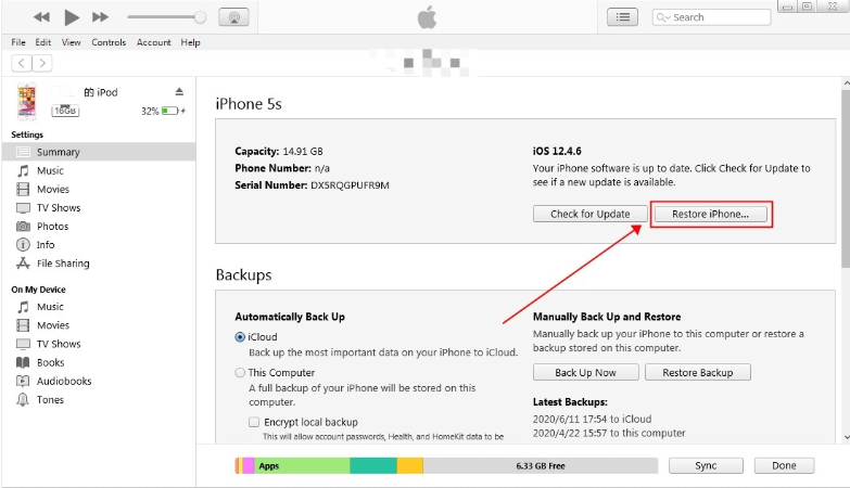 STEP 3. 위의 팝업 메시지가 표시되지 않으면 수동으로 아이폰을 복원할 수도 있습니다. "요약" 버튼을 클릭한 다음 " iPhone 복원 "을 클릭하십시오 .