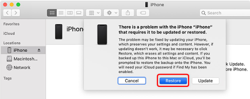 STEP 2. 몇 초 안에 iTunes/Finder가 장치의 문제를 감지하고 다음 팝업 메시지를 표시합니다. 이때 “복구” 버튼을 클릭하여 진행하시기 바랍니다.