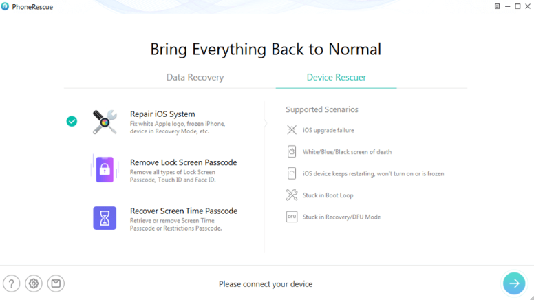 STEP 1. 컴퓨터에서 iOS용 PhoneRescue를 다운로드 받으세요. 다운로드 후 프로그램을 설치하고 Device Rescuer에서 iOS 시스템 복구를 클릭하세요
