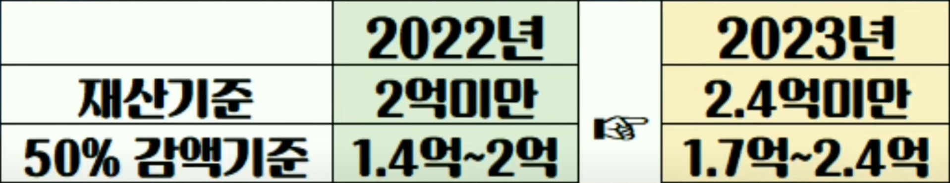 이러한 재산기준이 2023년부터는 재산합계액 기준이 2억원 미만에서 2.4억원 미만으로 바뀌고, 50% 감액 기준 또한, 14억원이상에서 1.7억원 이상 ~ 2.4억원 미만으로 바뀝니다.