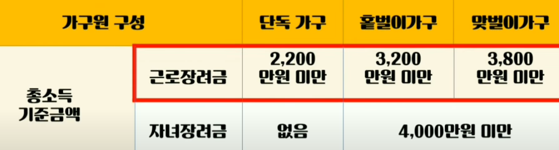 근로장려금은 일은 하지만 소득이 적은 분들께 정부가 지원하는 지원금으로 한 가구당 1명에게 지급되며, 직전년도 부부합산 총 소득이 단독가구 2,200만원 미만, 홑벌이 가구 3,200만원 미만, 맞벌이 가구 3,800만원 미만 이어야 했습니다.