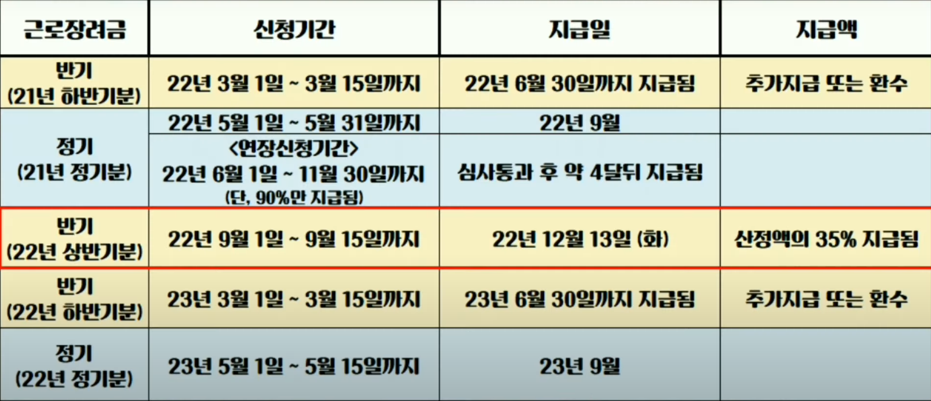 근로소득자에게 해당하는 2022년 상반기분 근로장려금 지급일은 2022년 12월 13일 화요일 이였으며, 2022년 하반기분에 대한 신청기간은 2023년 3월 1일부터 15일까지, 지급일은 2023년 6월 30일까지 지급된다고 합니다.