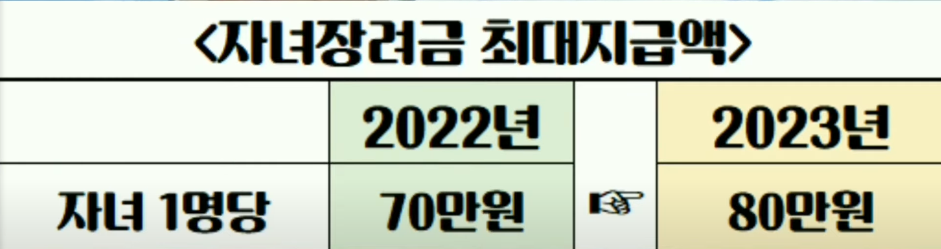 또한, 자녀장려금 최대 지급액은 2022년 1명당 70만원에서 2023년 80만원으로 인상됩니다. 재산요건은 근로장려금과 동일하게 적용됩니다.