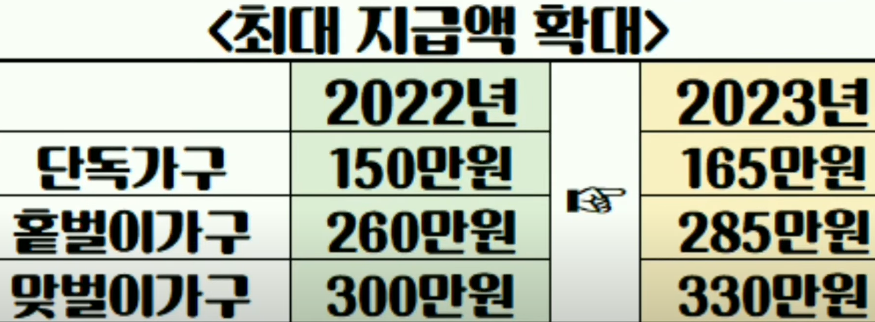 이러한 최대 지급액이 2023년 1월 1일부터 물가 인상 등을 고려해 최대 10%까지 인상되었습니다. 개편안에 따르면 근로장려금은 2023년 신청분부터 단독가구 최대 165만원, 홑벌이 가구 285만원, 맞벌이가구 330만원으로 확대되었습니다.