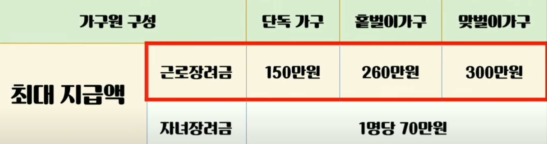 또한, 근로 장려금 최대 지급액은 단독가구 150만원, 홑벌이 가구 260만원, 맞벌이 가구 300만원이었으며, 자녀장려금은 1명당 최대 70만원까지 지급 했습니다.